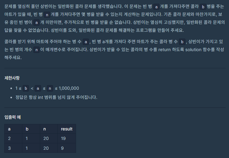 1. 새로 얻게 되는 콜라 개수 = 총 빈 병 개수 / 교환 기준 개수